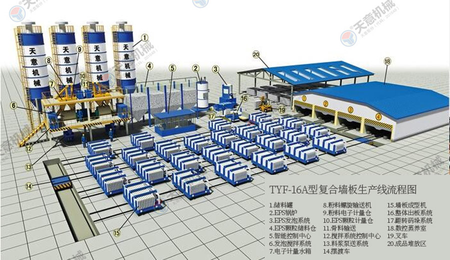 TY12型墻板生產(chǎn)線包括:墻板成型機(jī)、整體穿抽管系統(tǒng)、發(fā)泡系統(tǒng)、水箱、電子計(jì)量儲料倉、螺旋上料輸送機(jī)、儲料罐、螺旋輸送機(jī)、EPS熟化料倉、硫化干燥床、EPS預(yù)發(fā)機(jī)、數(shù)控配電室、發(fā)泡攪拌機(jī)、整體出板系統(tǒng)、叉車、成品堆放區(qū)、擺渡車。