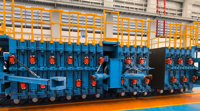 工作原理:模具的開合由下方的液壓機(jī)構(gòu)完成,和墻板機(jī)類似。合模后的鎖緊由上方和兩端的拉桿裝置實(shí)現(xiàn)。下方的強(qiáng)制同步裝置保證了大板在開合時(shí)的兩側(cè)同步。大板下方的輪組保證了大板在開合時(shí)不傾斜、不倒伏。